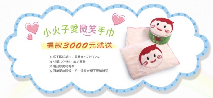 為鼓勵社會大眾發揮愛心共襄盛舉,凡單筆捐款滿3,000元,將由中國信託商業銀行贊助提供「小火子愛微笑手巾」贈品一份,捐款收據及贈品兌換券,將於扣款後4至6週寄達,捐款人可於104年4月30日前持贈品兌換券至中國信託全國各分行兌換贈品。贈品以實物為準,同一筆捐款限領一份,捐款金額不累積贈送。